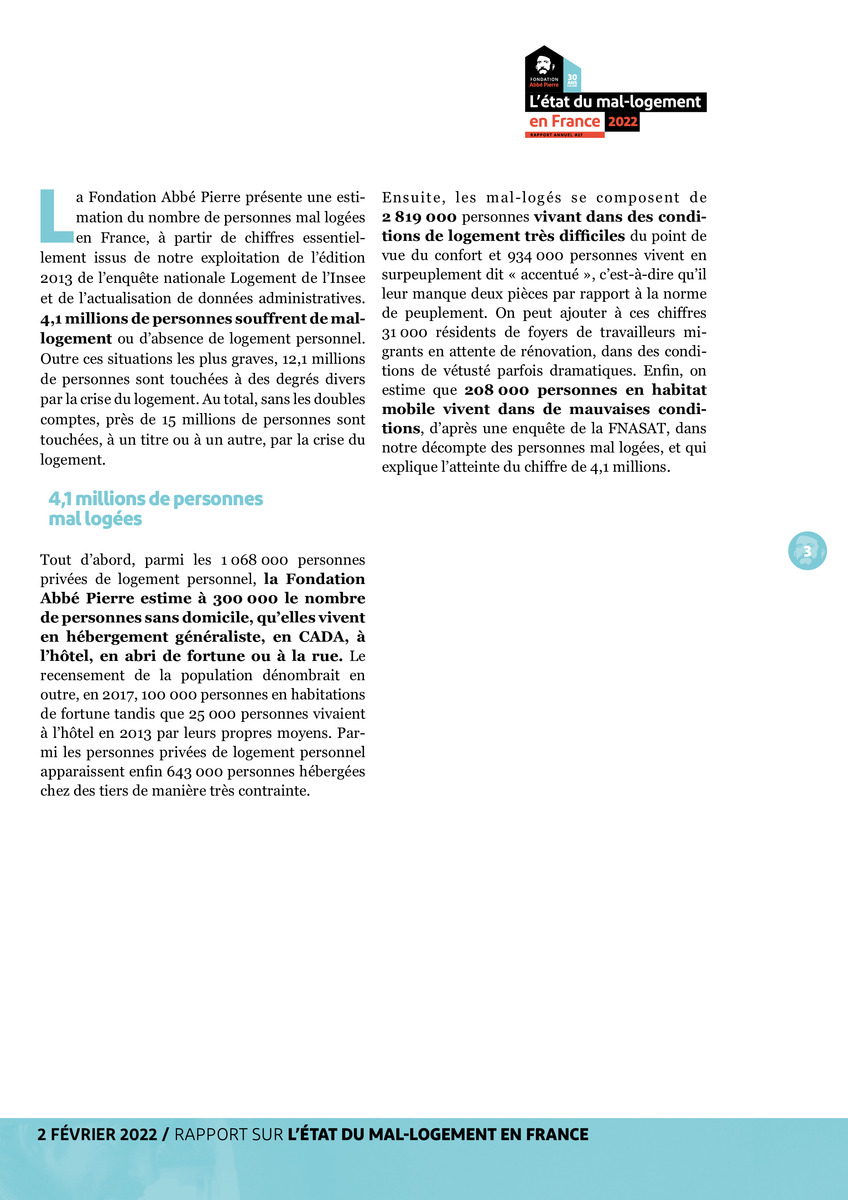 En janvier 2022, La fondation Abbé Pierre publie son 27ème rapport sur l'état du mal logement en France.