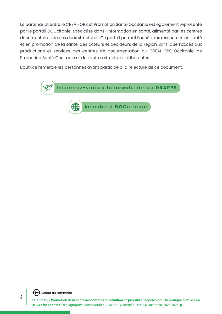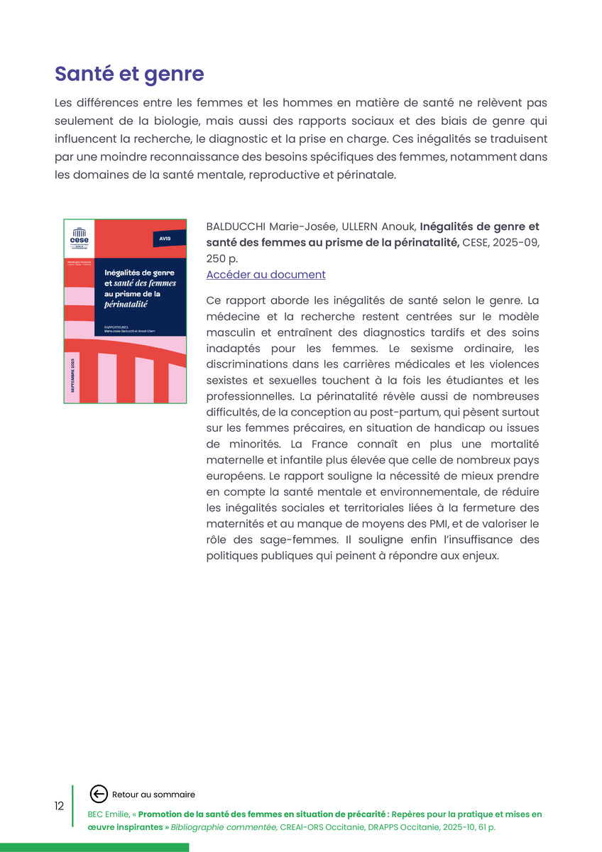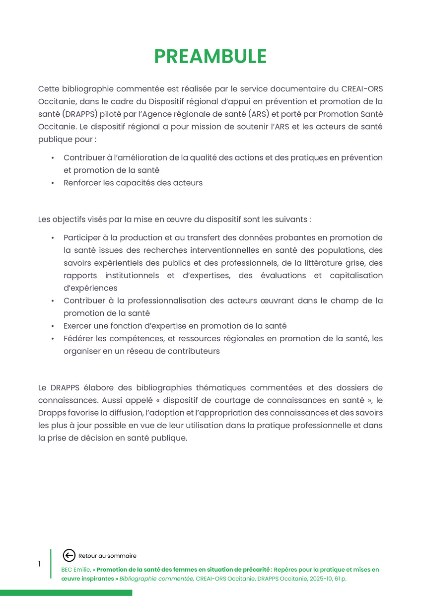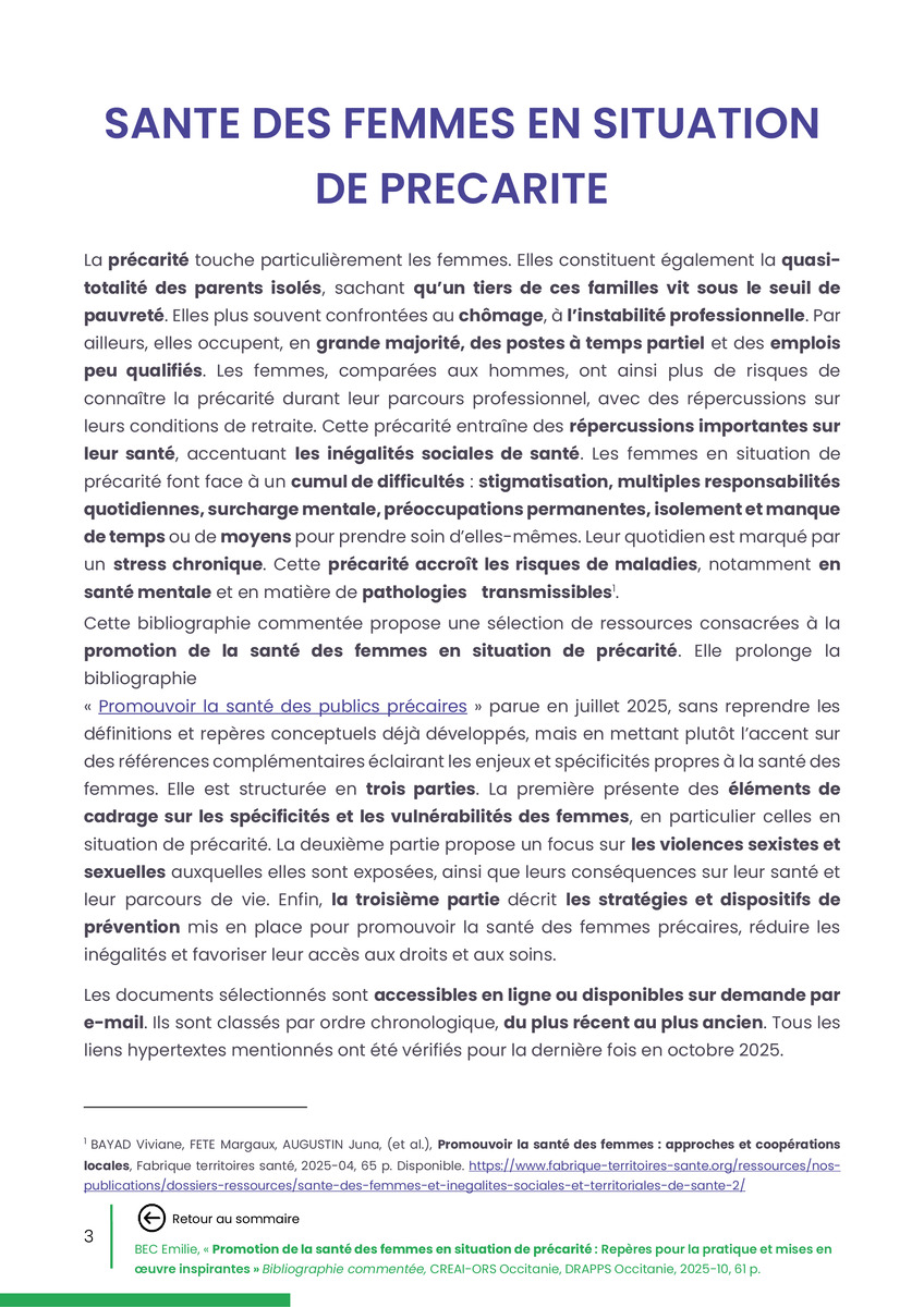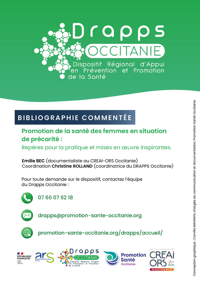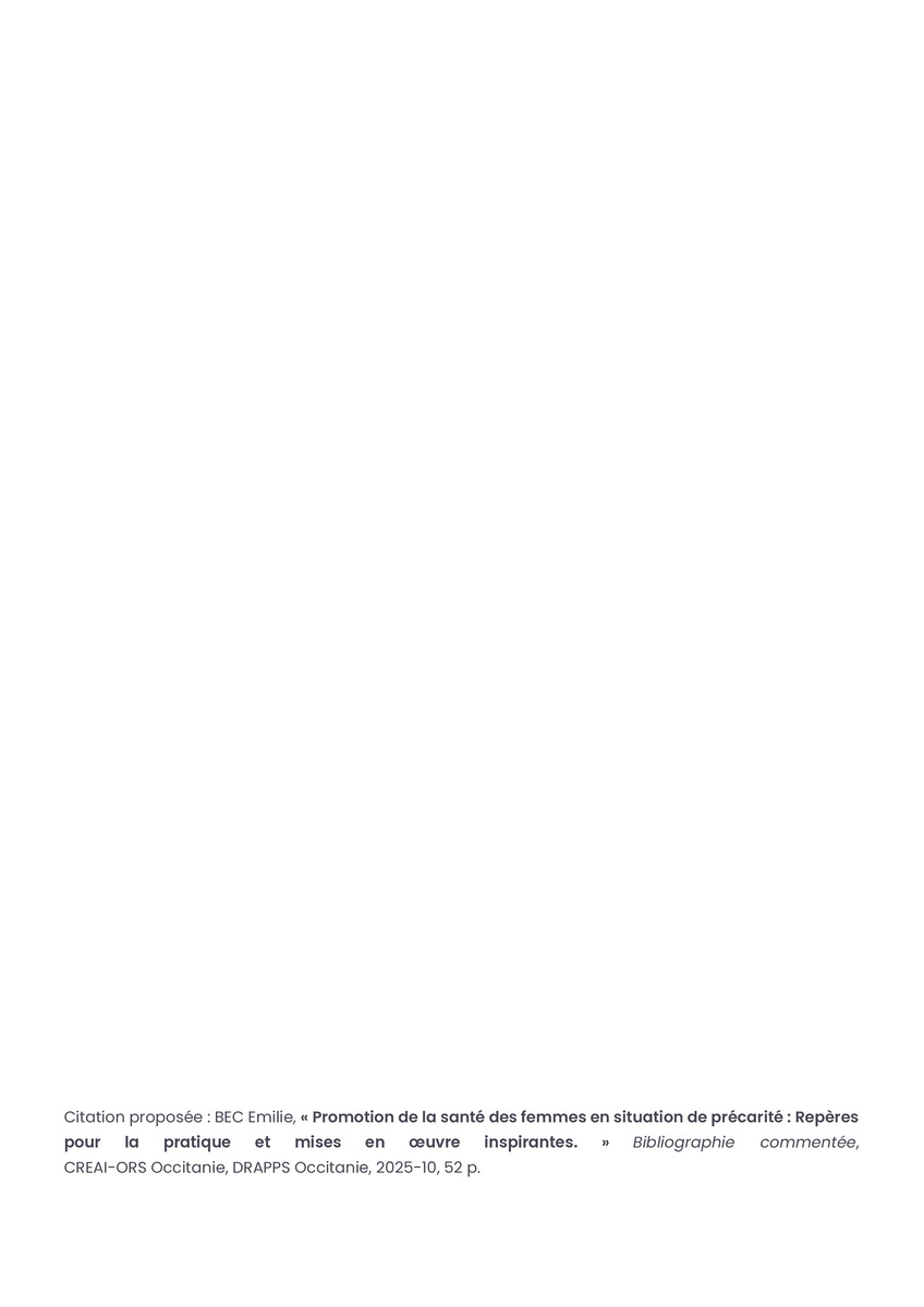 Référence : BEC Emilie, Rolland Christine (coord.), Promotion de la santé des femmes en situation de précarité : Repères pour la pratiques et mises en œuvre inspirantes, Bibliographie commentée, CREAI-ORS Occitanie, DRAPPS Occitanie, Promotion santé Occitanie, 2026/03, 65 p.