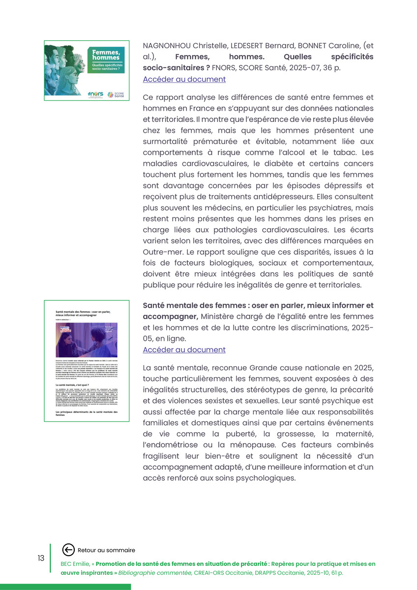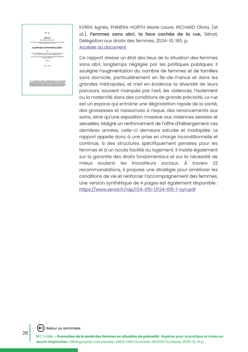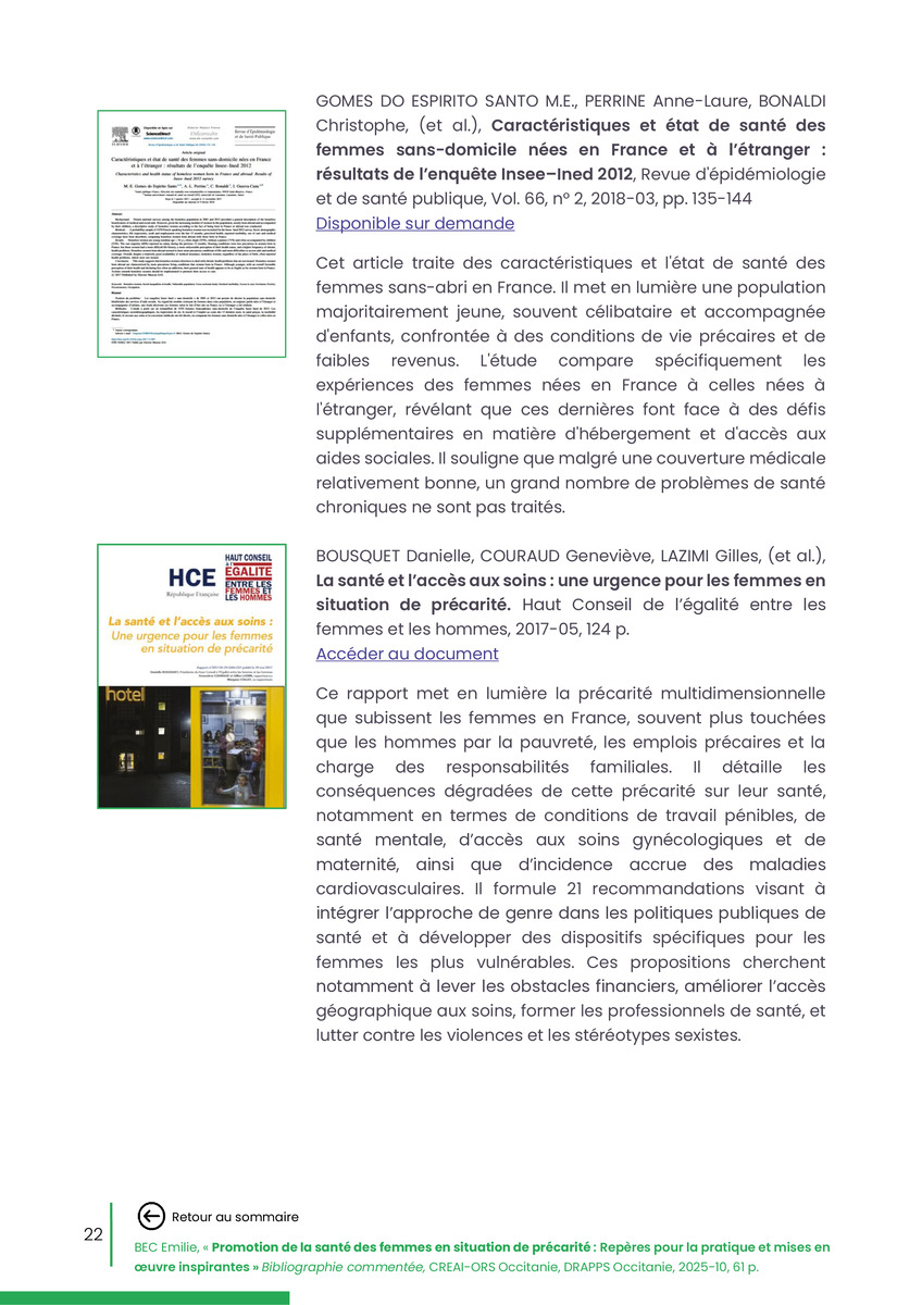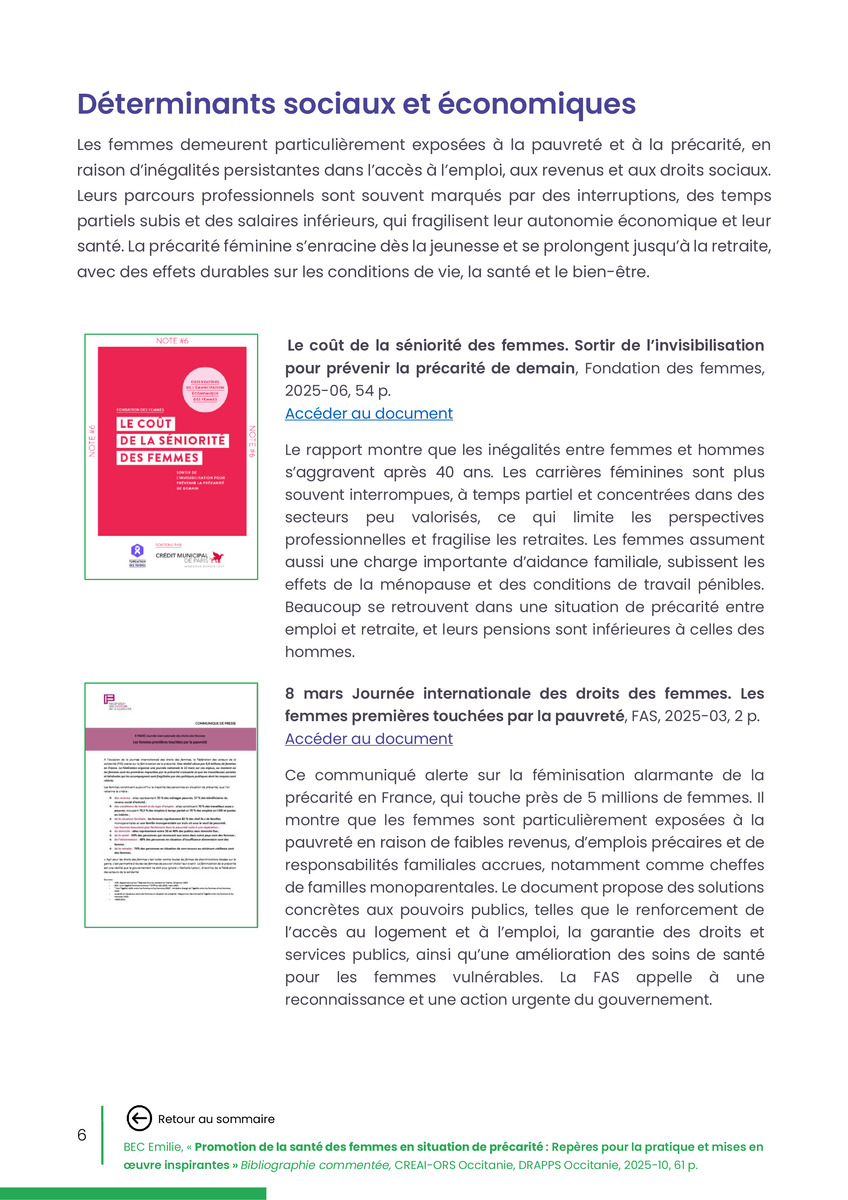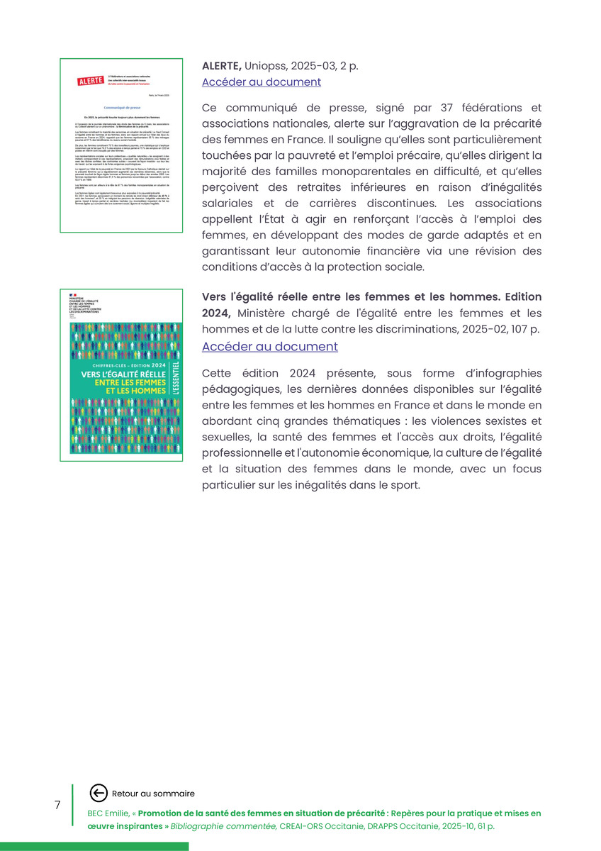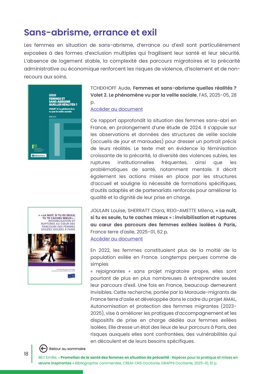 Référence : BEC Emilie, Rolland Christine (coord.), Promotion de la santé des femmes en situation de précarité : Repères pour la pratiques et mises en œuvre inspirantes, Bibliographie commentée, CREAI-ORS Occitanie, DRAPPS Occitanie, Promotion santé Occitanie, 2026/03, 65 p.
