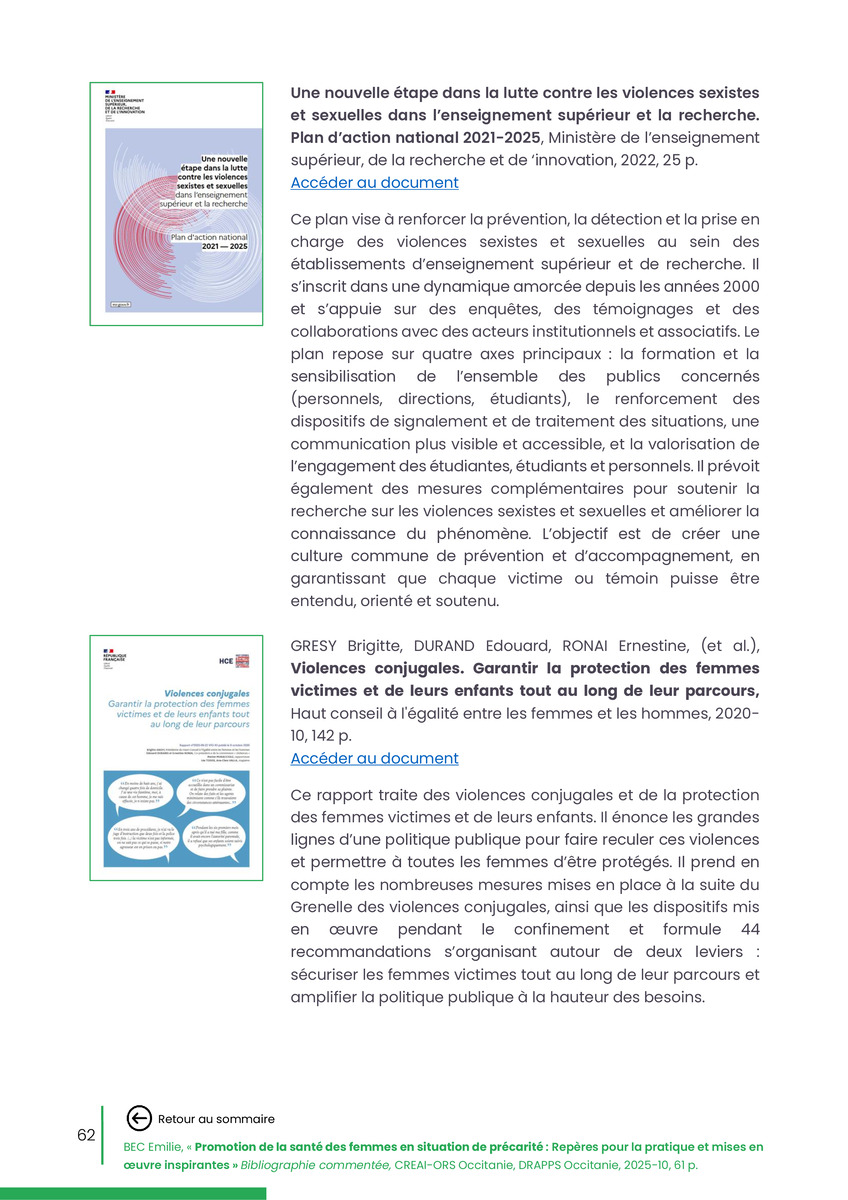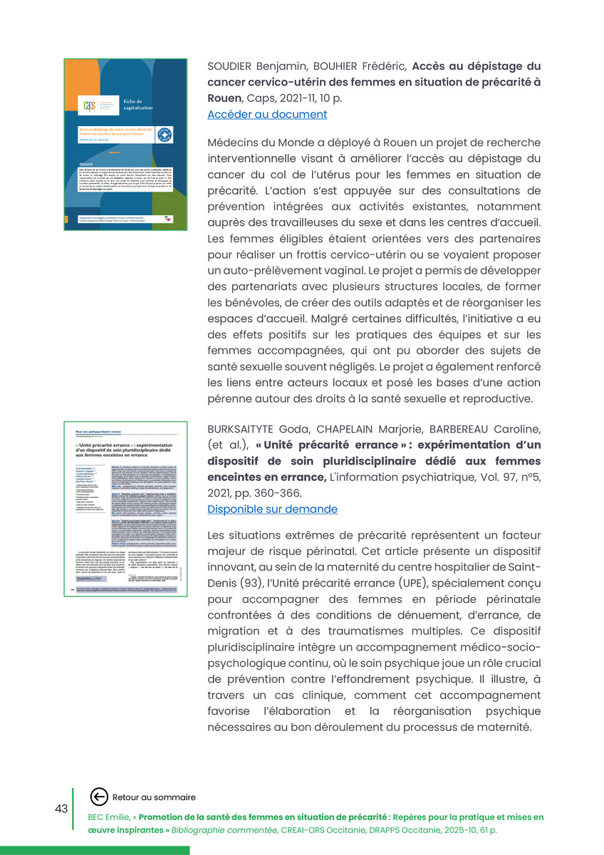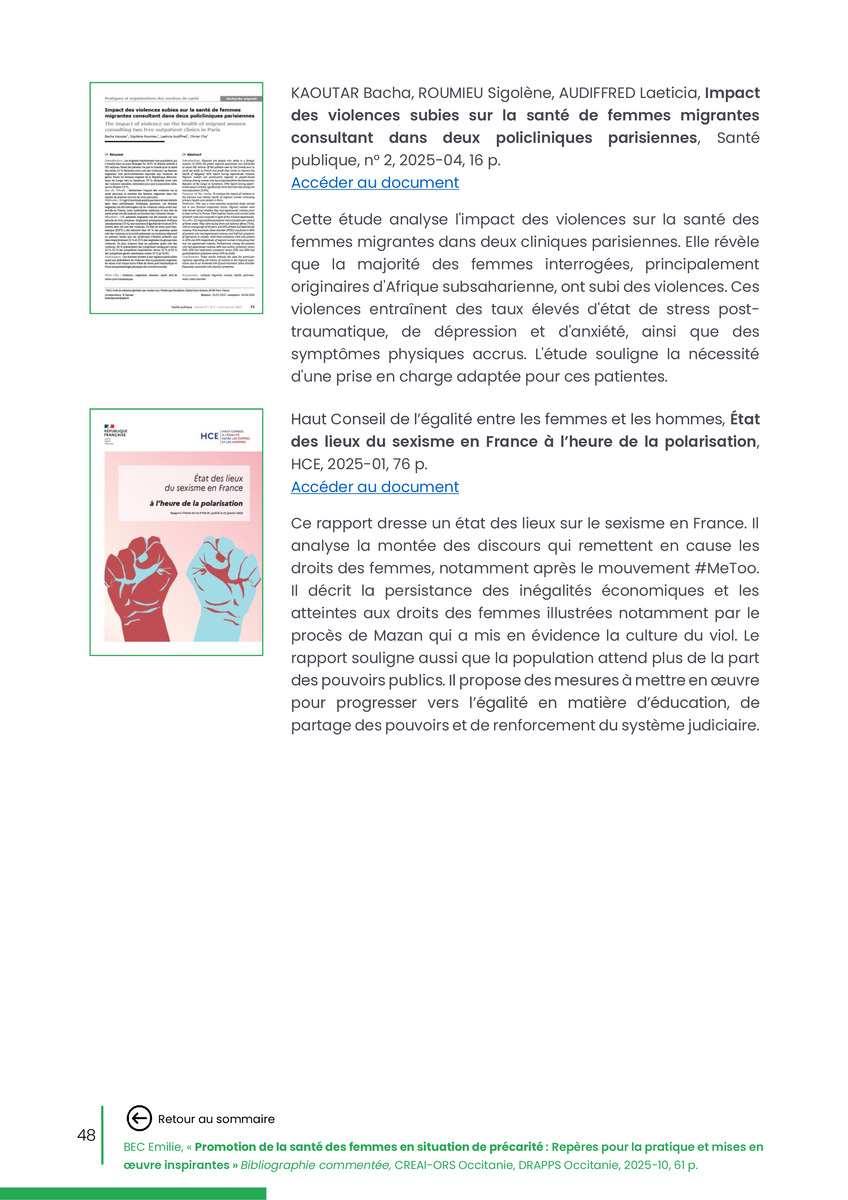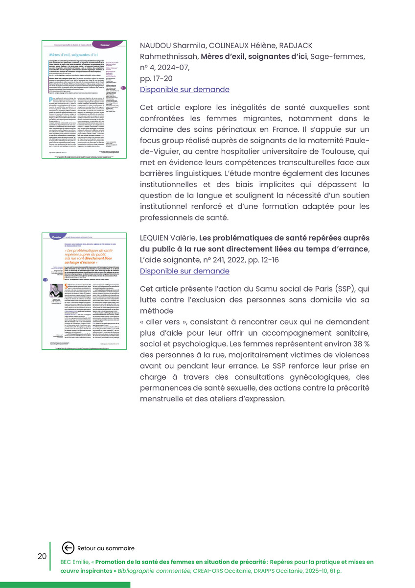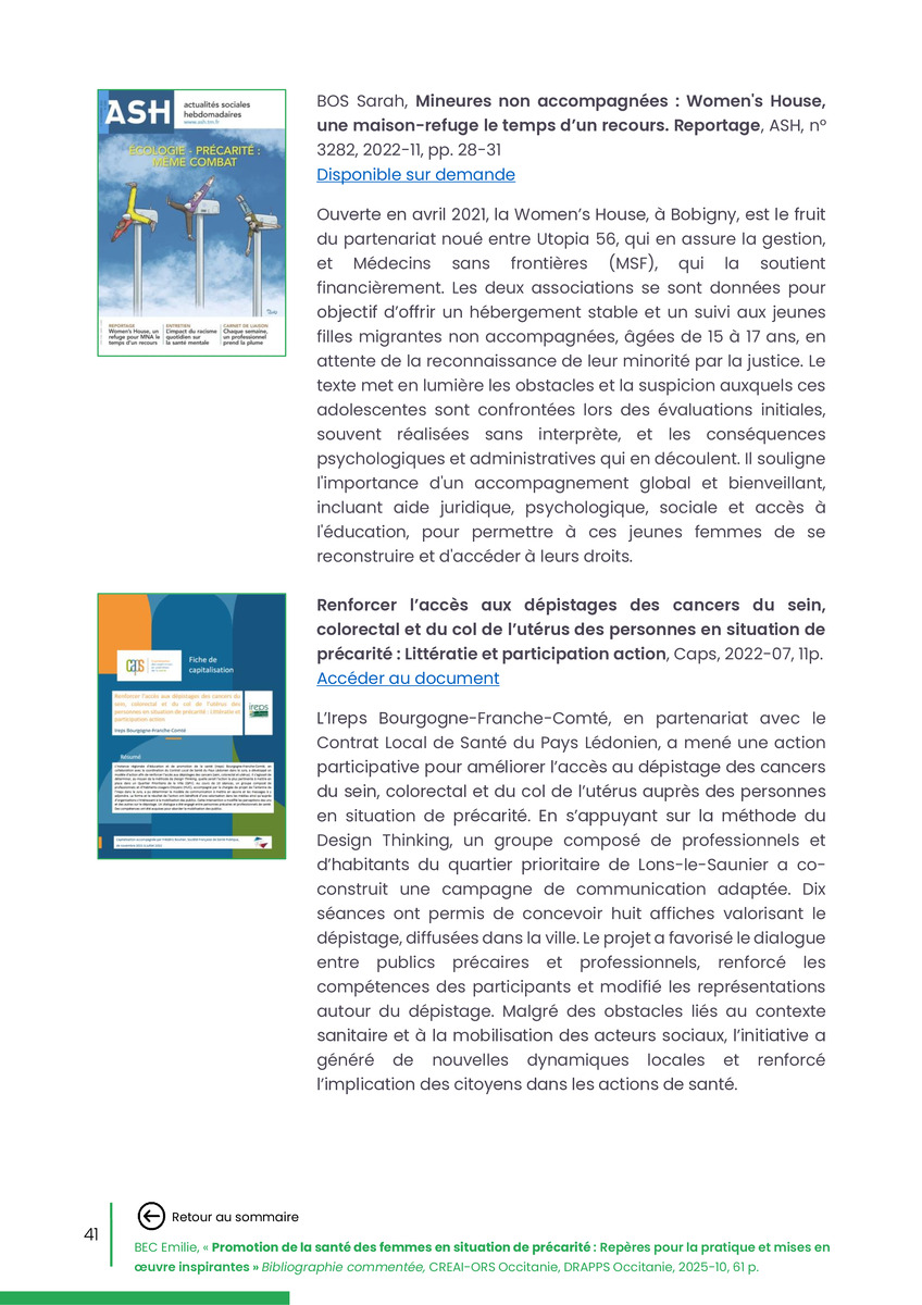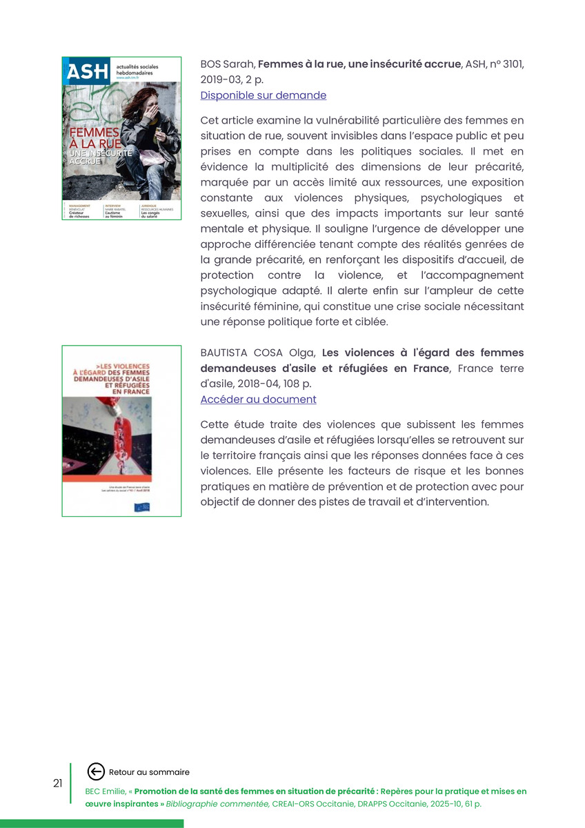 Référence : BEC Emilie, Rolland Christine (coord.), Promotion de la santé des femmes en situation de précarité : Repères pour la pratiques et mises en œuvre inspirantes, Bibliographie commentée, CREAI-ORS Occitanie, DRAPPS Occitanie, Promotion santé Occitanie, 2026/03, 65 p.