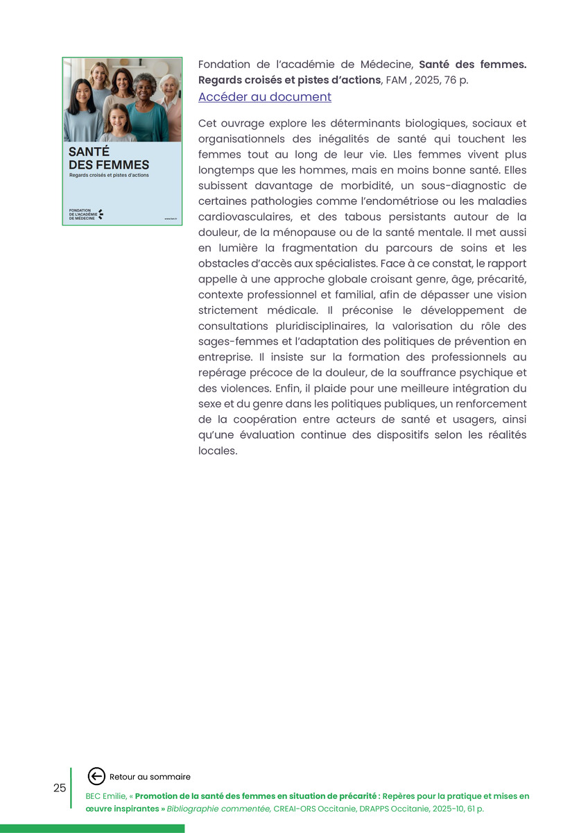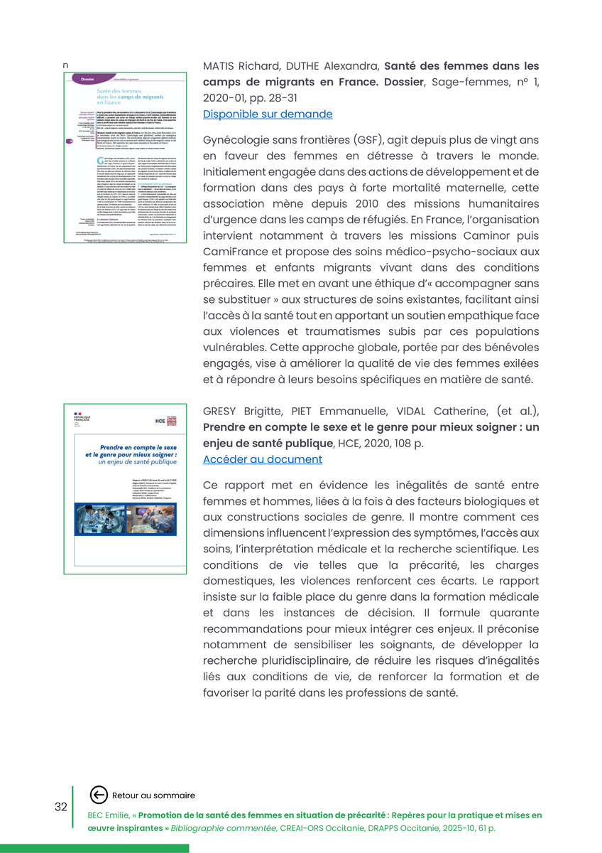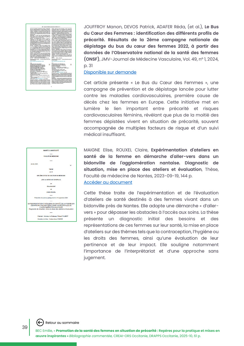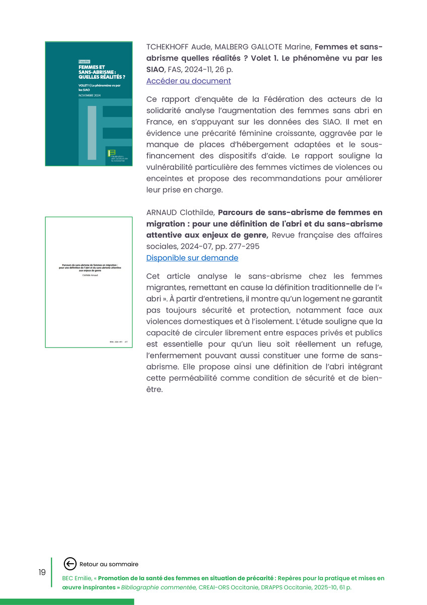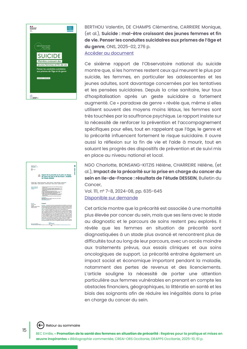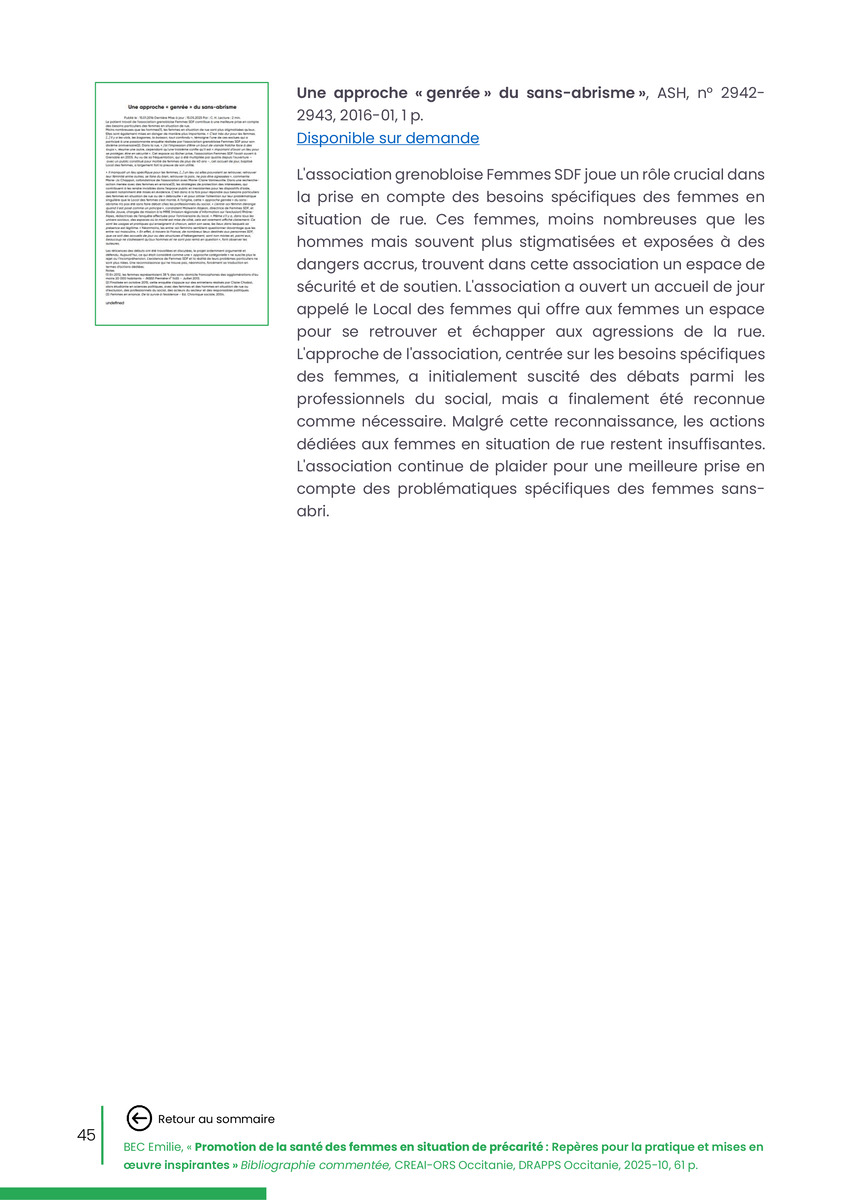 Référence : BEC Emilie, Rolland Christine (coord.), Promotion de la santé des femmes en situation de précarité : Repères pour la pratiques et mises en œuvre inspirantes, Bibliographie commentée, CREAI-ORS Occitanie, DRAPPS Occitanie, Promotion santé Occitanie, 2026/03, 65 p.