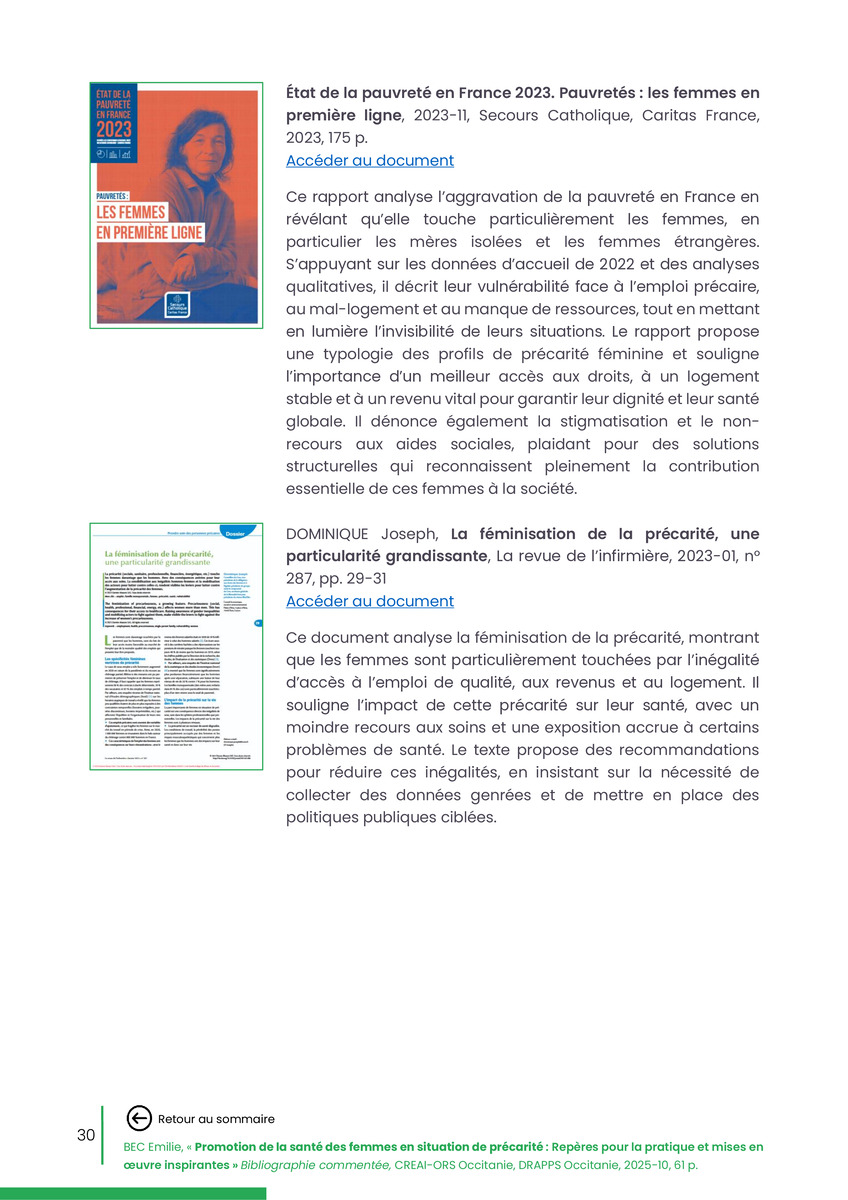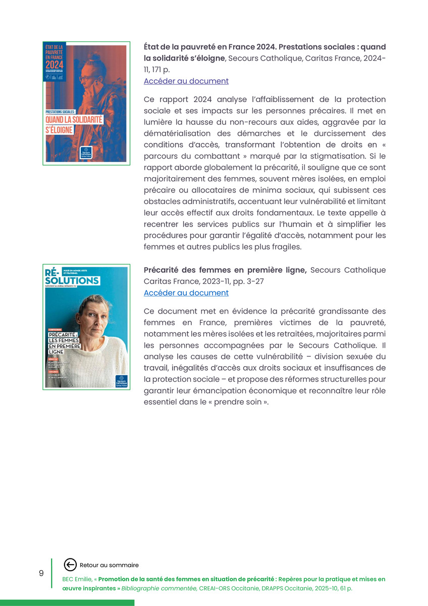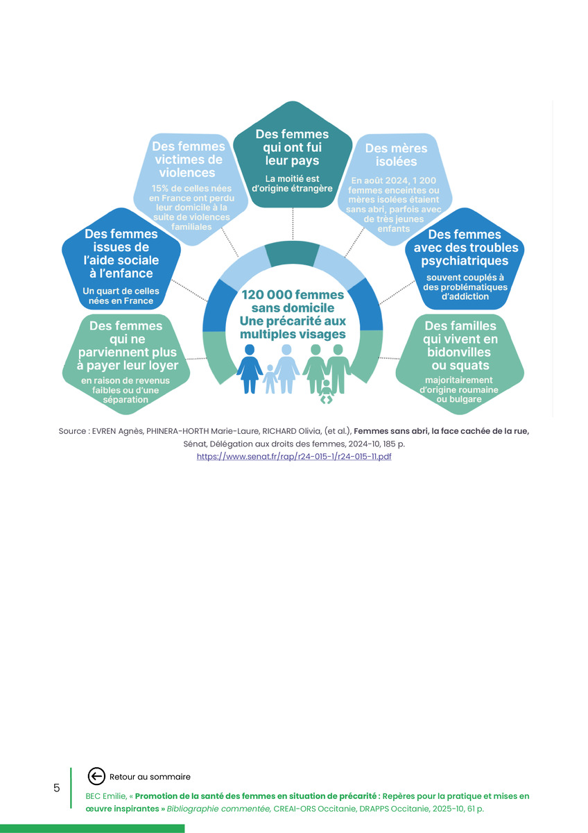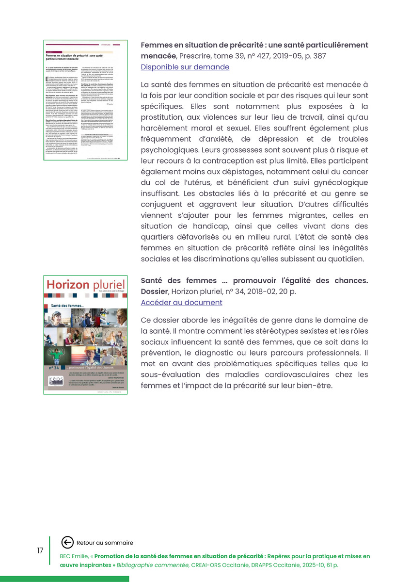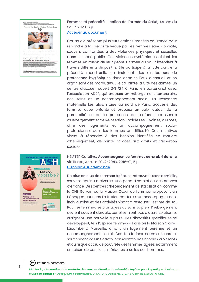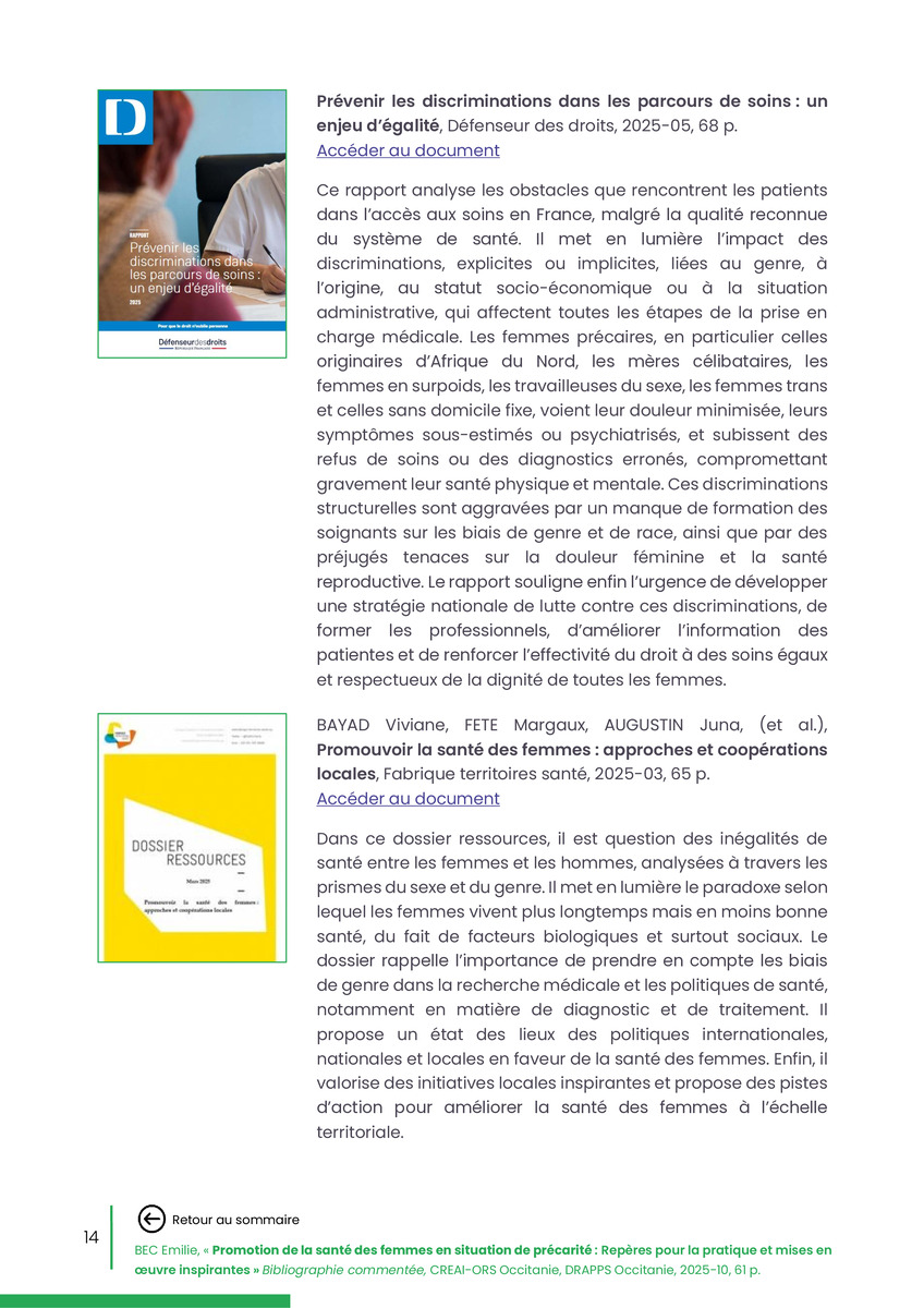Référence : BEC Emilie, Rolland Christine (coord.), Promotion de la santé des femmes en situation de précarité : Repères pour la pratiques et mises en œuvre inspirantes, Bibliographie commentée, CREAI-ORS Occitanie, DRAPPS Occitanie, Promotion santé Occitanie, 2026/03, 65 p.