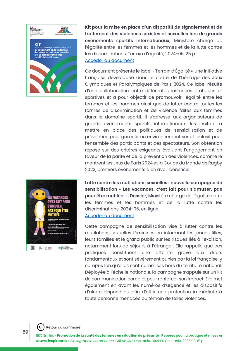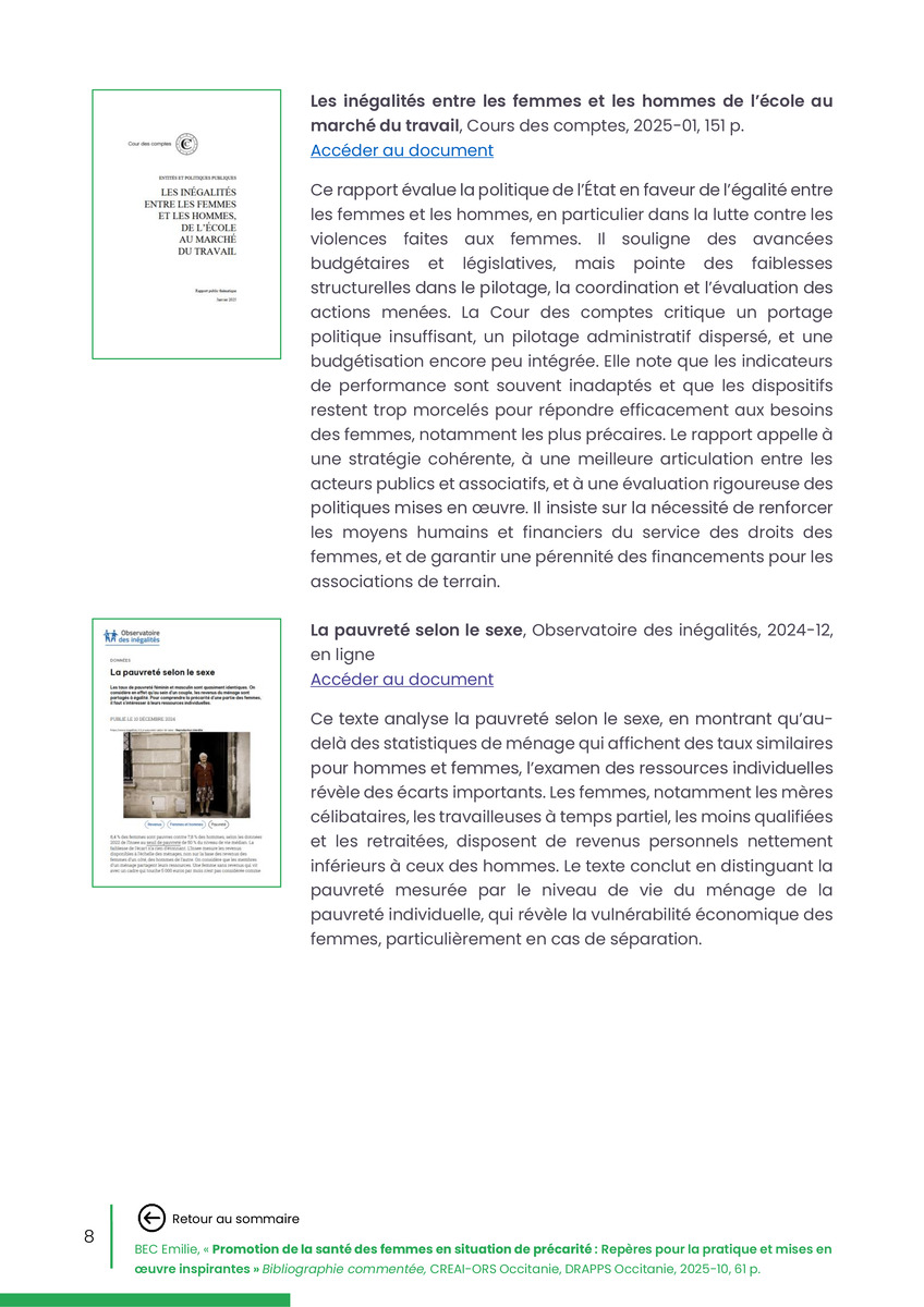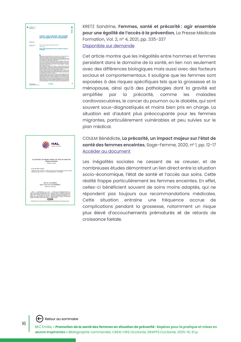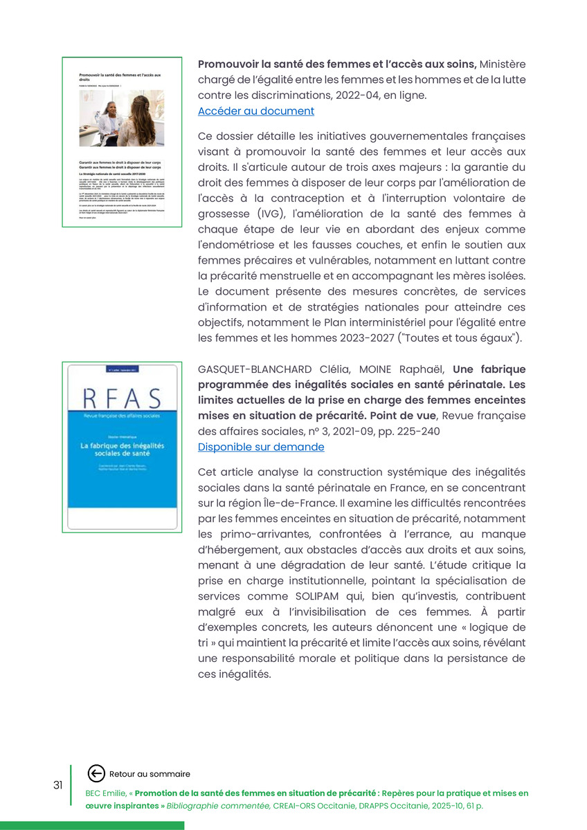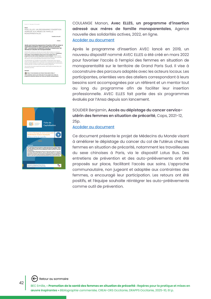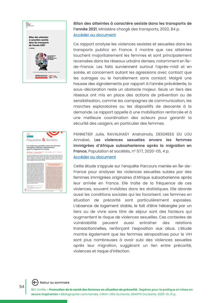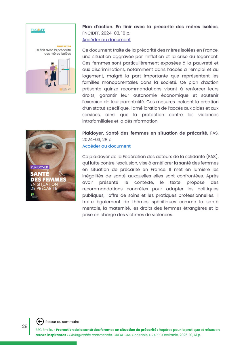 Référence : BEC Emilie, Rolland Christine (coord.), Promotion de la santé des femmes en situation de précarité : Repères pour la pratiques et mises en œuvre inspirantes, Bibliographie commentée, CREAI-ORS Occitanie, DRAPPS Occitanie, Promotion santé Occitanie, 2026/03, 65 p.