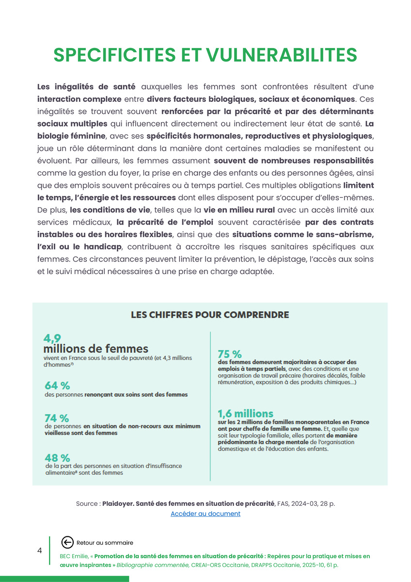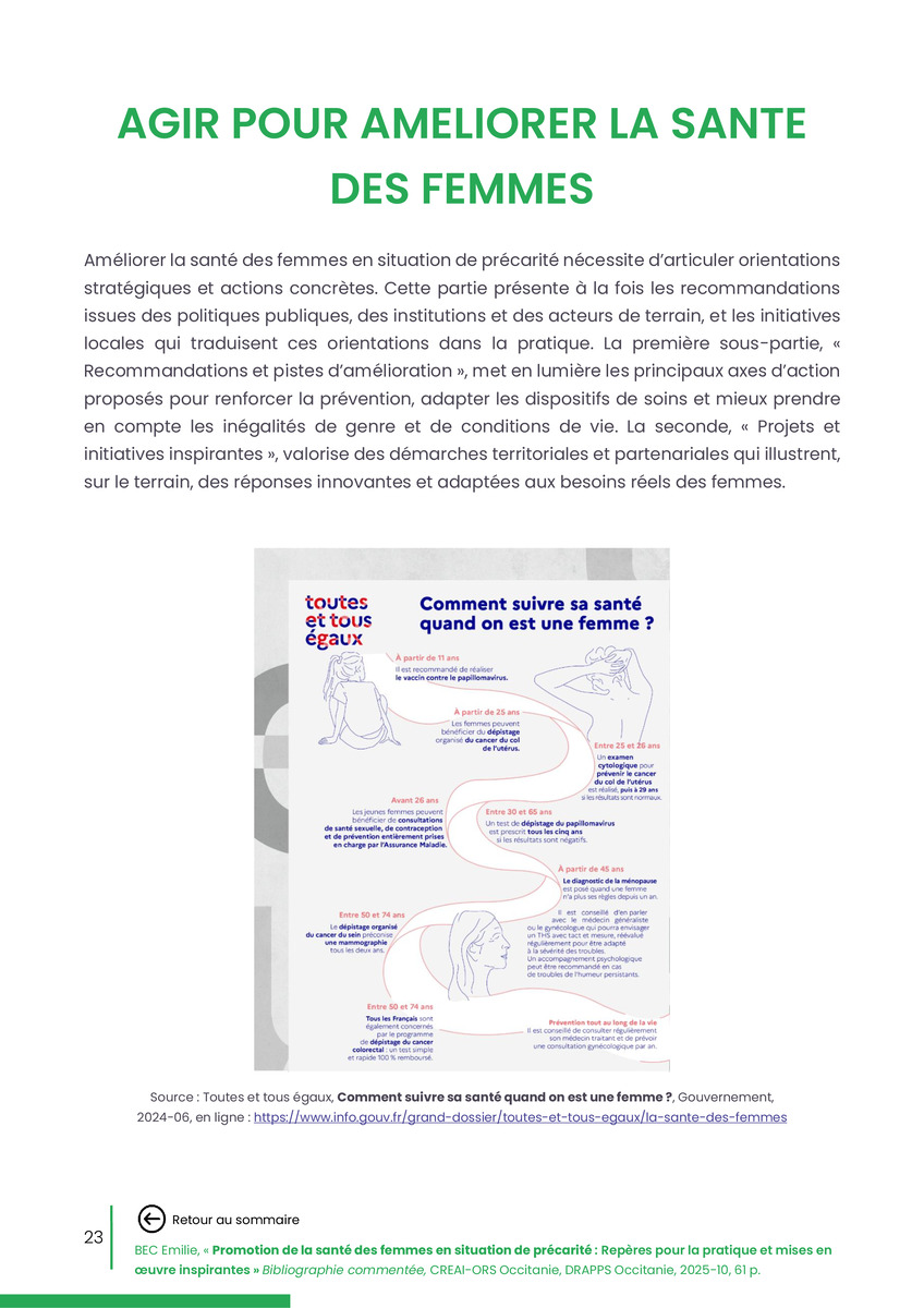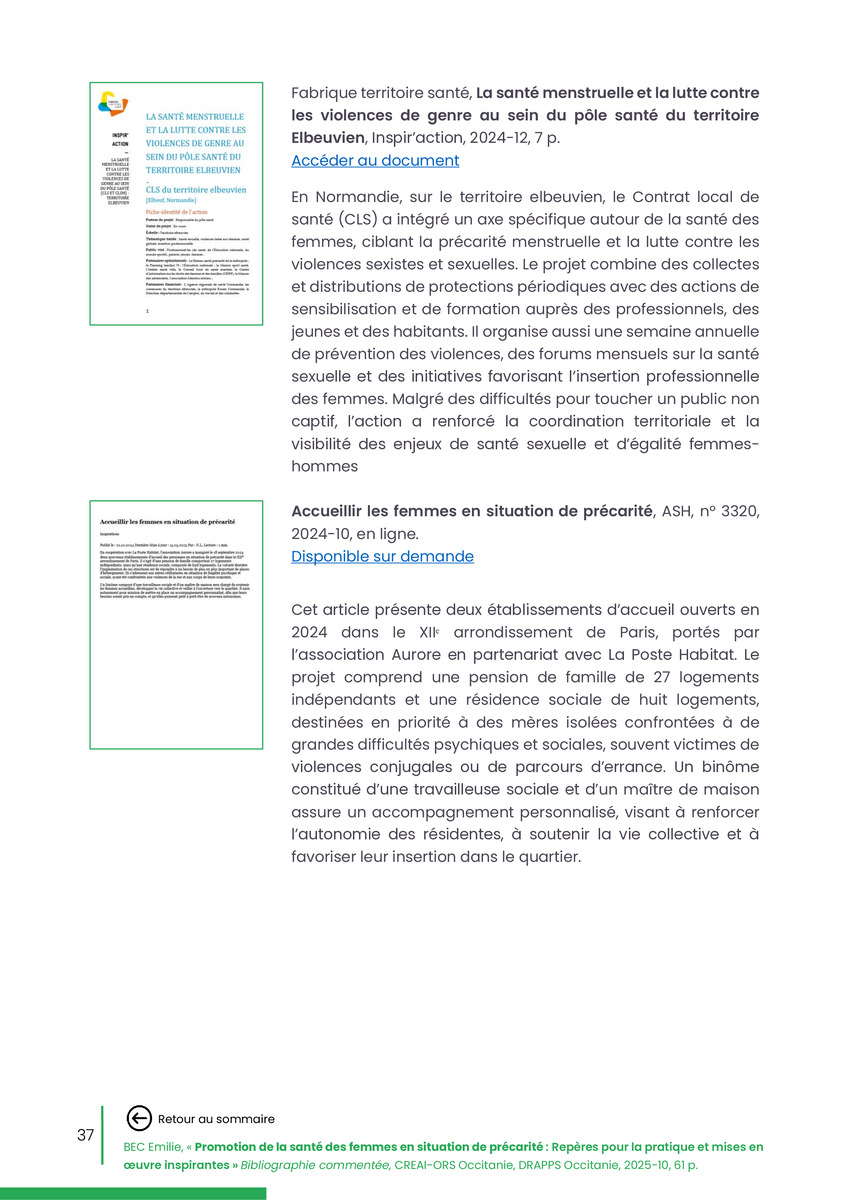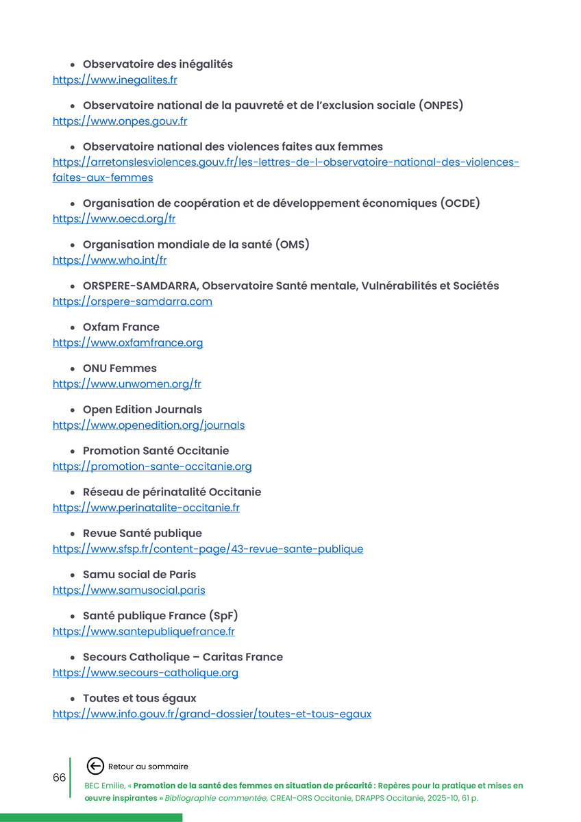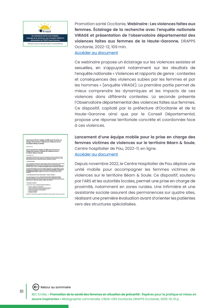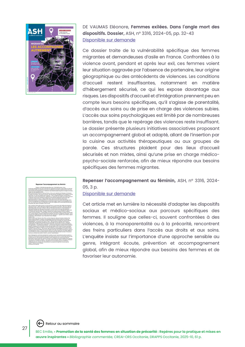 Référence : BEC Emilie, Rolland Christine (coord.), Promotion de la santé des femmes en situation de précarité : Repères pour la pratiques et mises en œuvre inspirantes, Bibliographie commentée, CREAI-ORS Occitanie, DRAPPS Occitanie, Promotion santé Occitanie, 2026/03, 65 p.