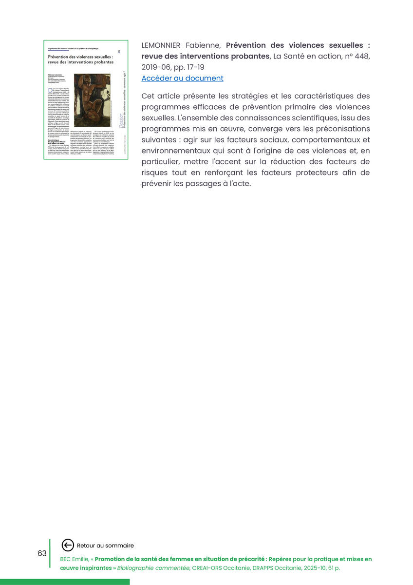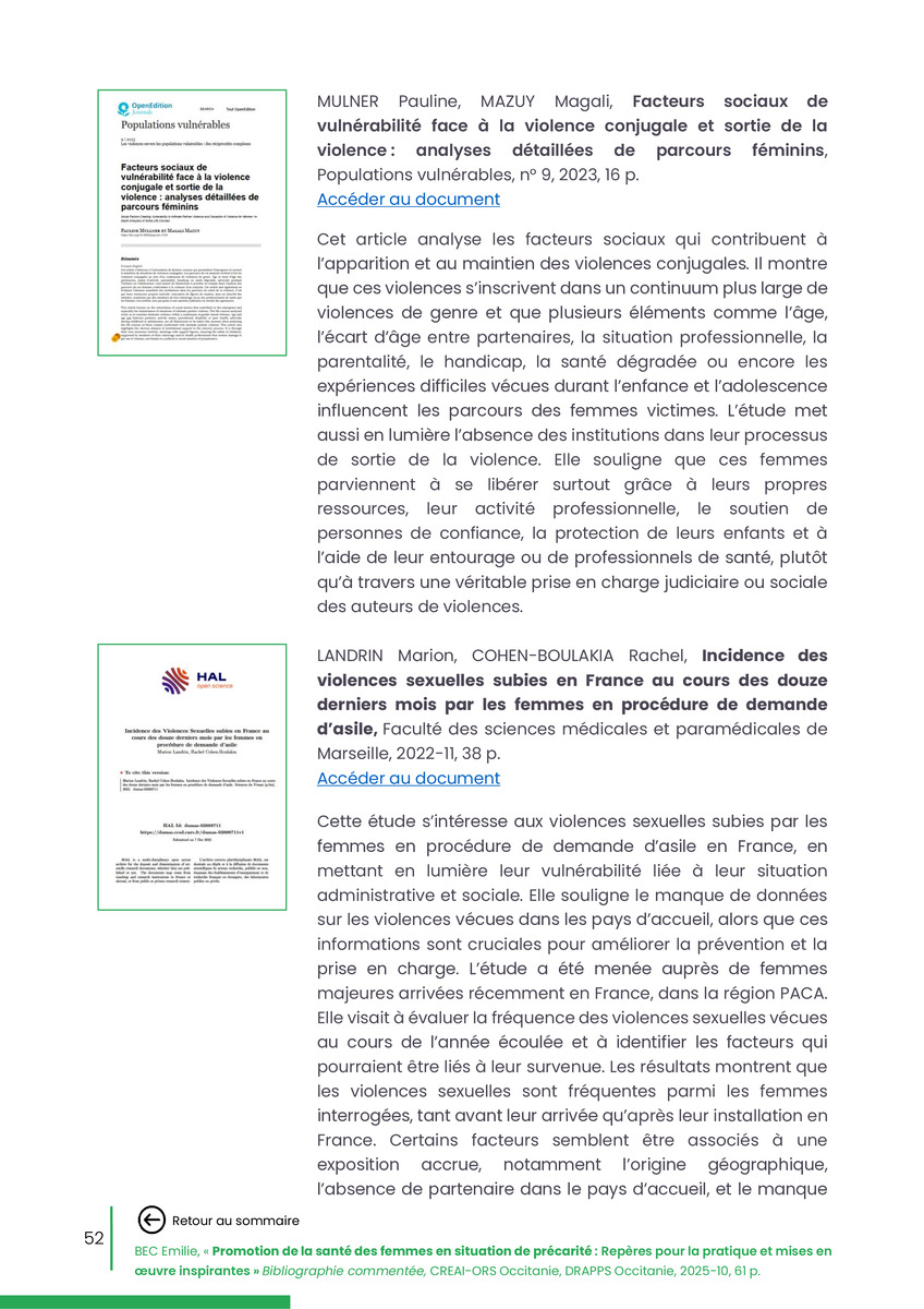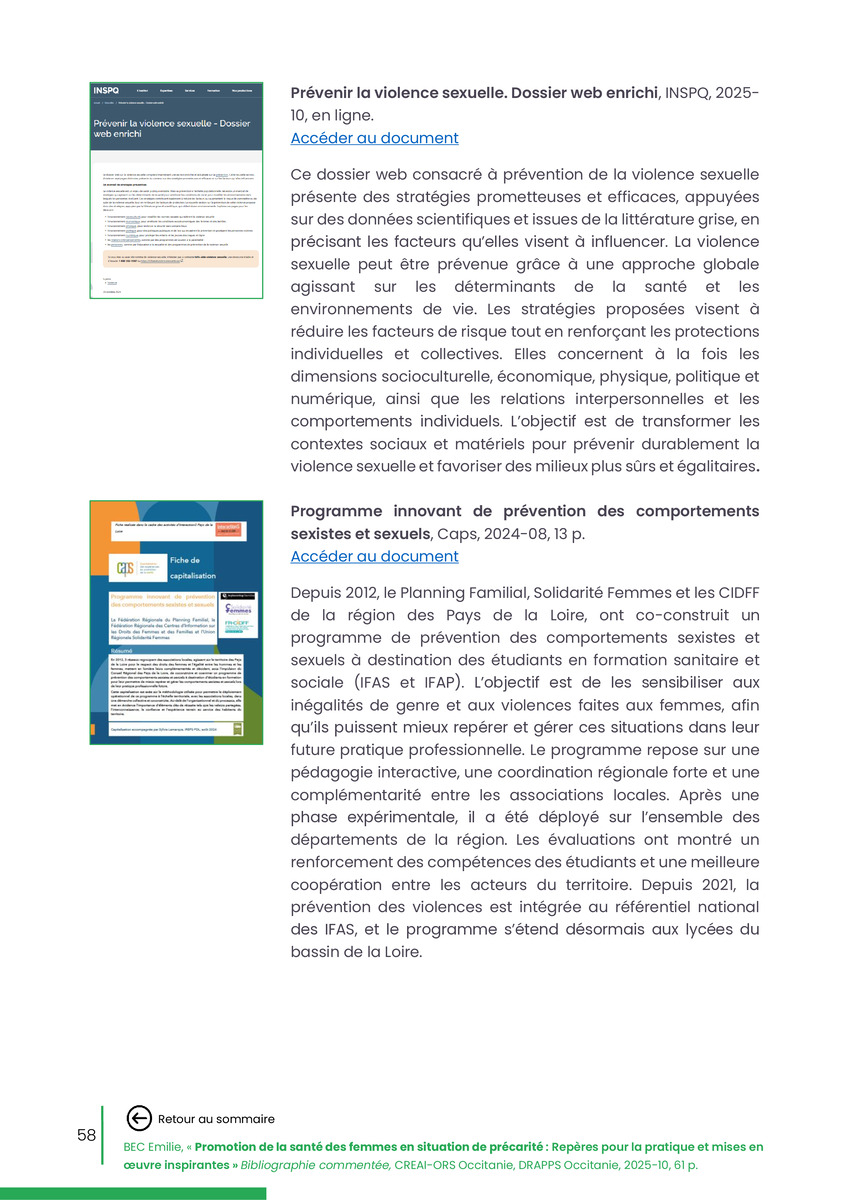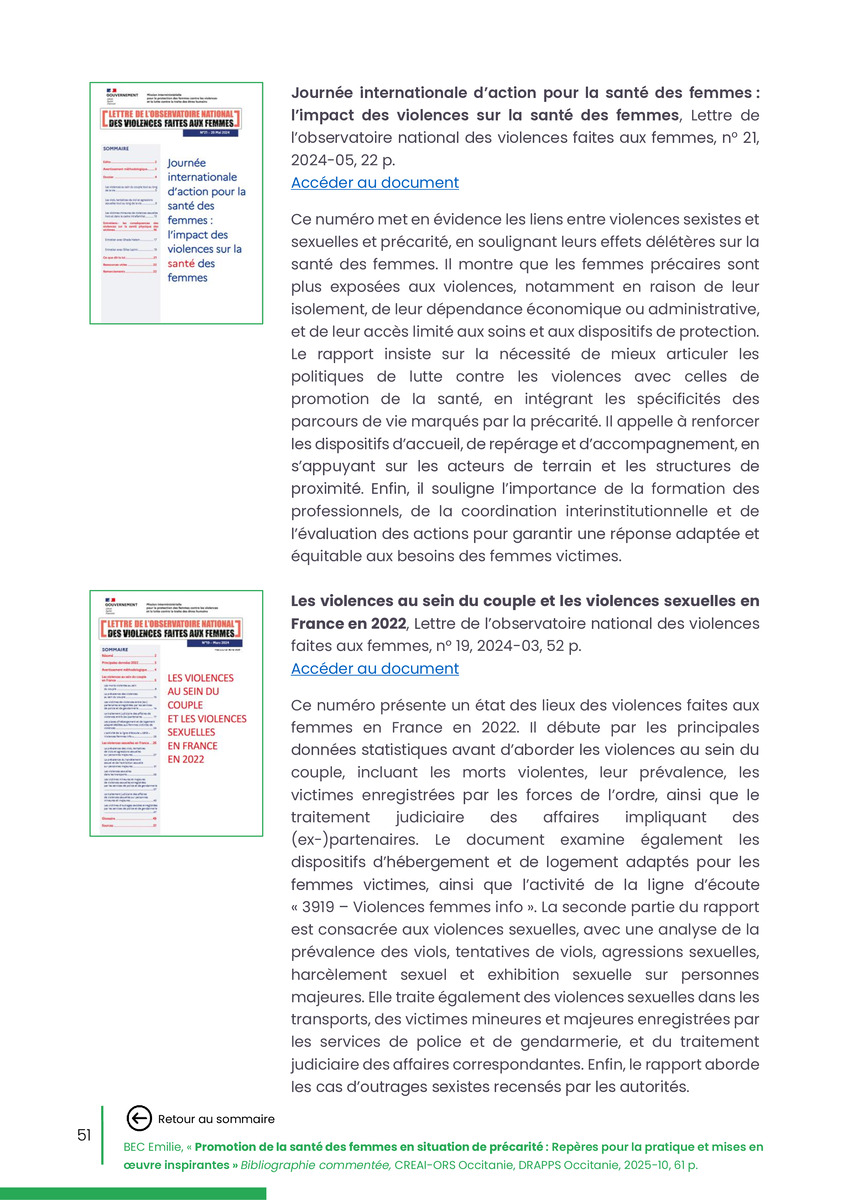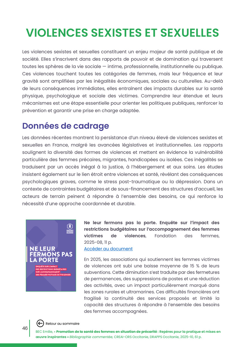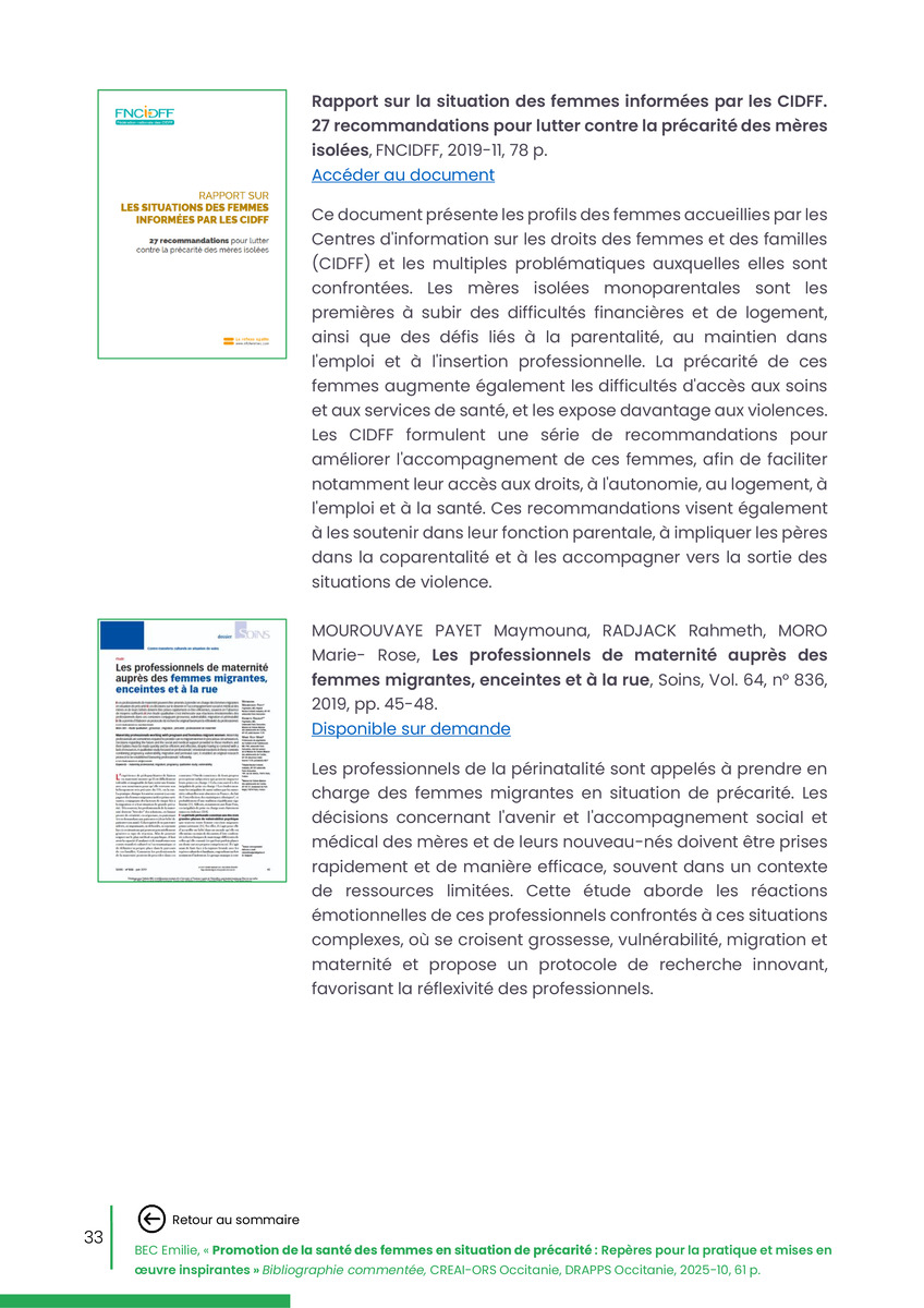 Référence : BEC Emilie, Rolland Christine (coord.), Promotion de la santé des femmes en situation de précarité : Repères pour la pratiques et mises en œuvre inspirantes, Bibliographie commentée, CREAI-ORS Occitanie, DRAPPS Occitanie, Promotion santé Occitanie, 2026/03, 65 p.