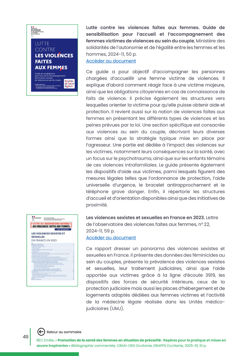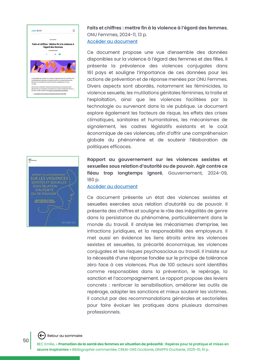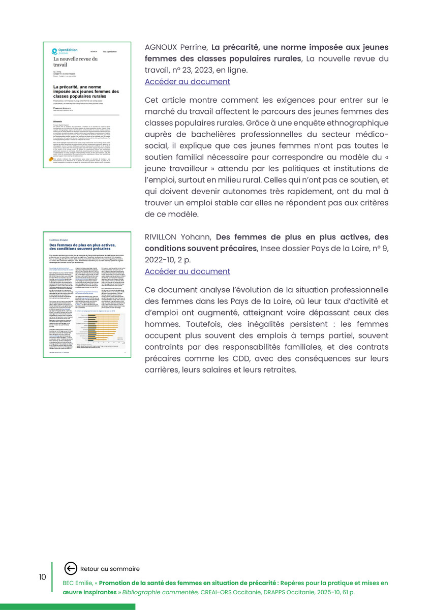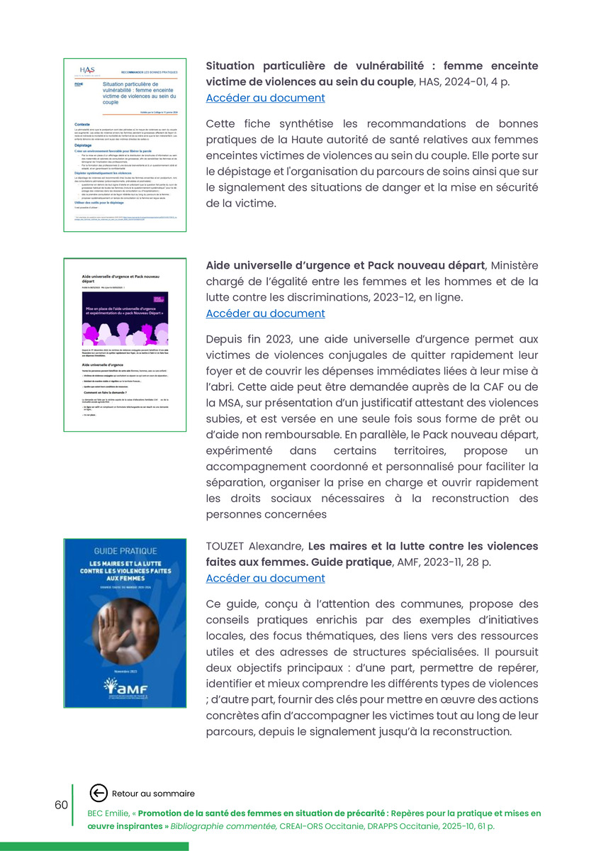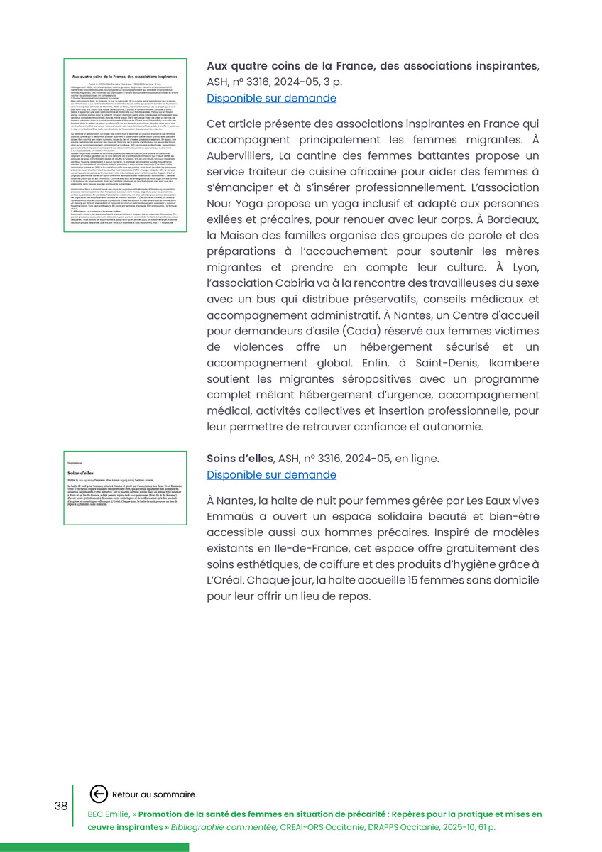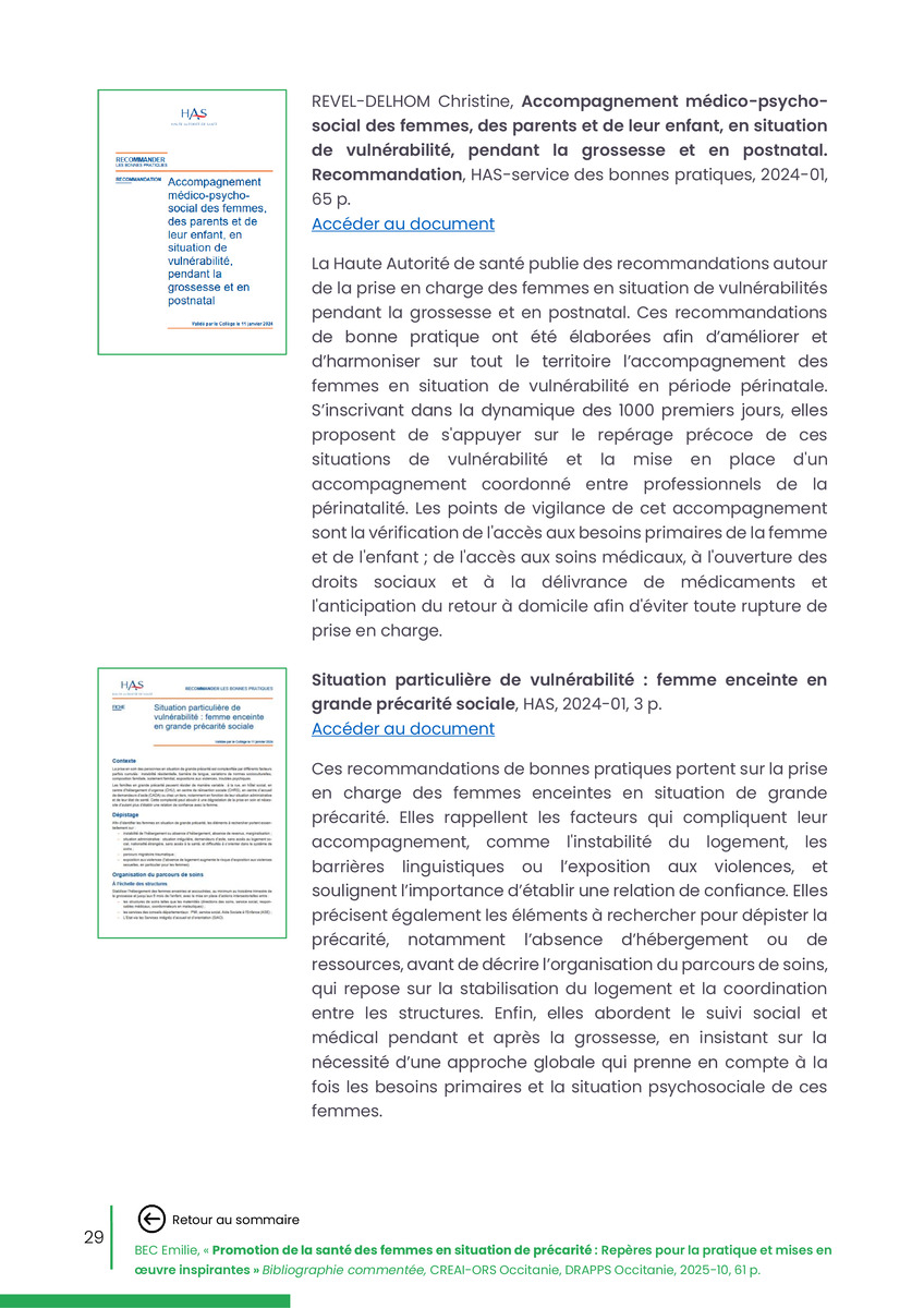 Référence : BEC Emilie, Rolland Christine (coord.), Promotion de la santé des femmes en situation de précarité : Repères pour la pratiques et mises en œuvre inspirantes, Bibliographie commentée, CREAI-ORS Occitanie, DRAPPS Occitanie, Promotion santé Occitanie, 2026/03, 65 p.