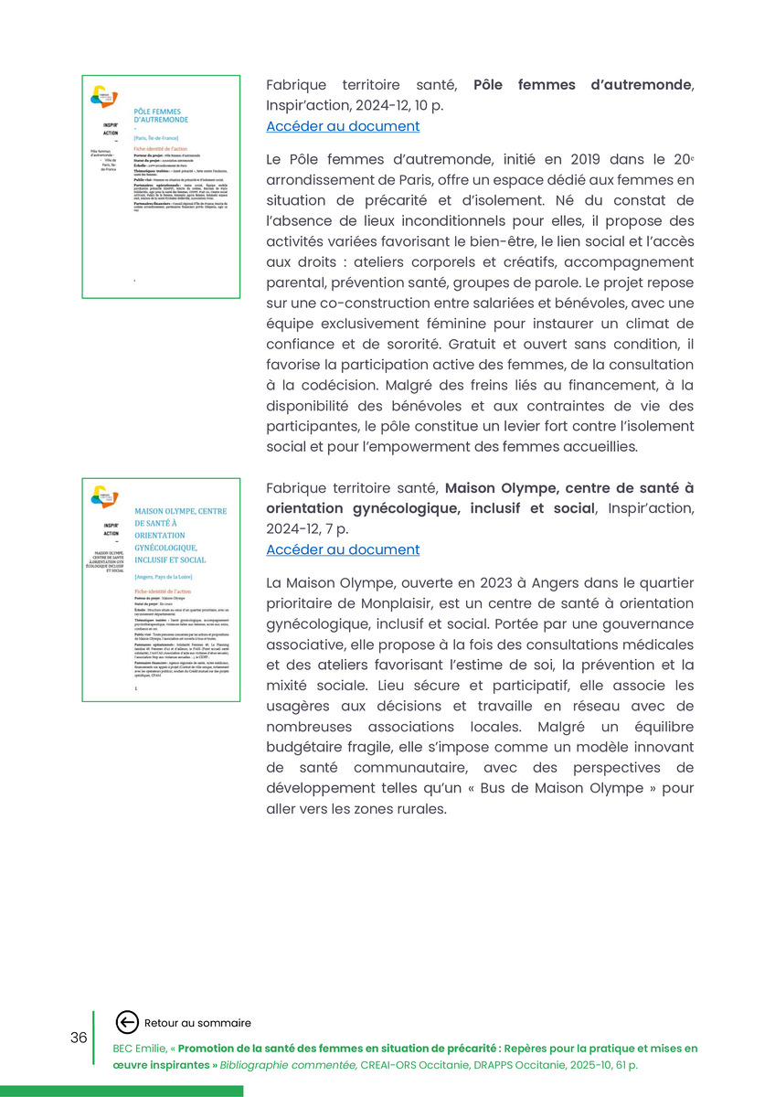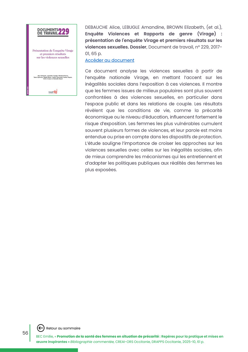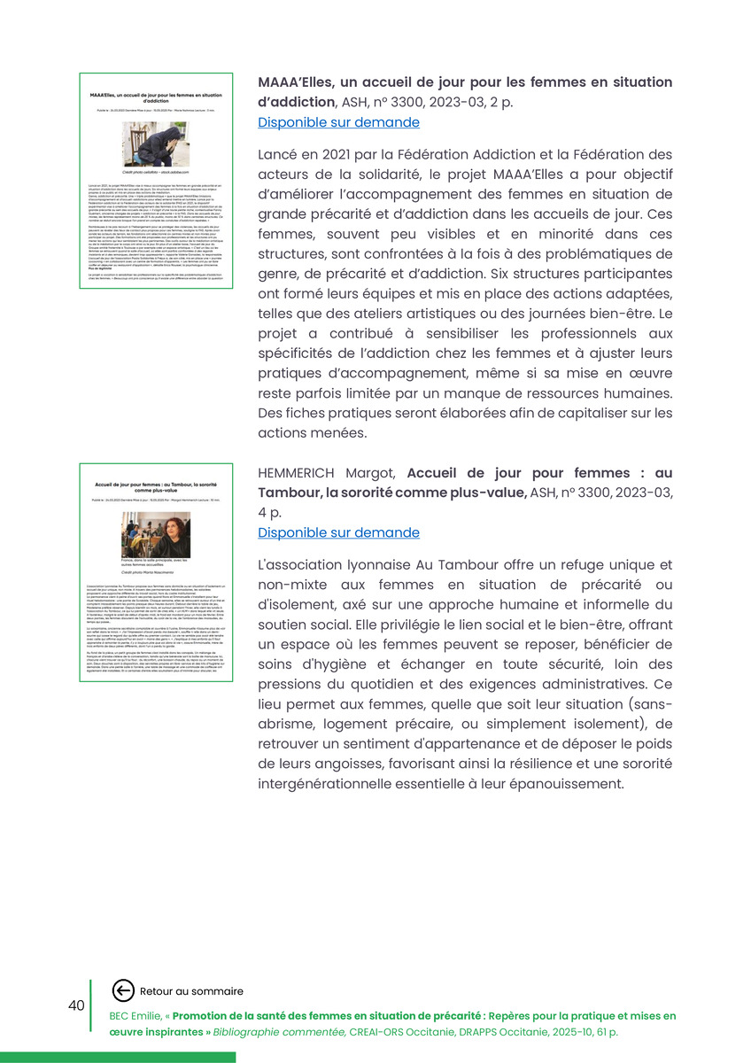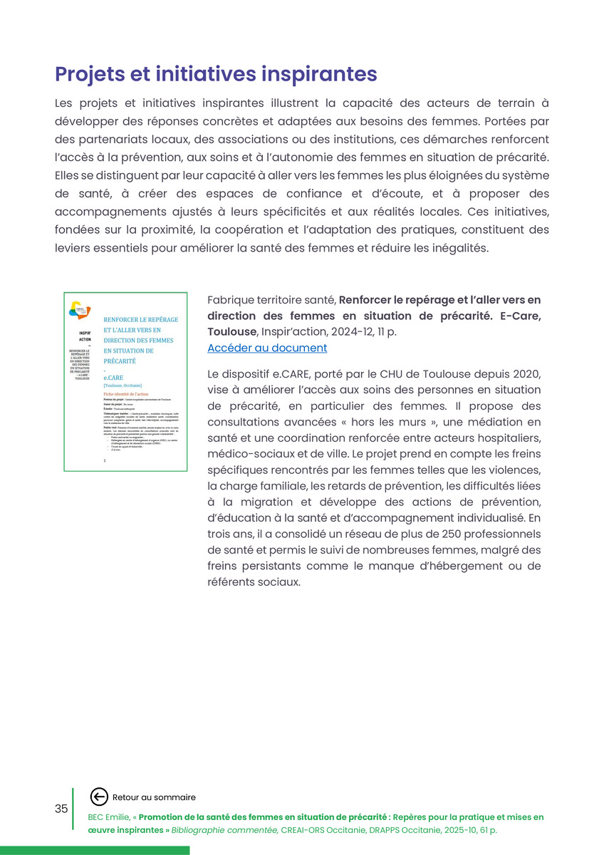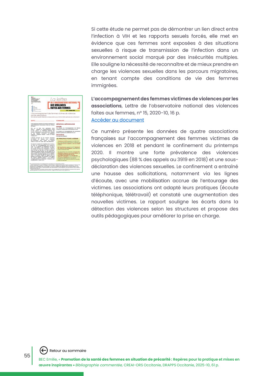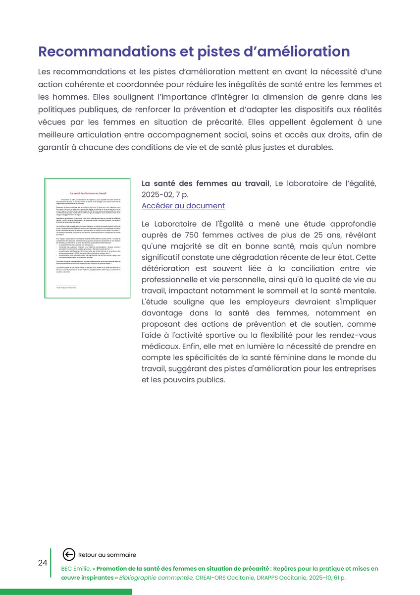 Référence : BEC Emilie, Rolland Christine (coord.), Promotion de la santé des femmes en situation de précarité : Repères pour la pratiques et mises en œuvre inspirantes, Bibliographie commentée, CREAI-ORS Occitanie, DRAPPS Occitanie, Promotion santé Occitanie, 2026/03, 65 p.